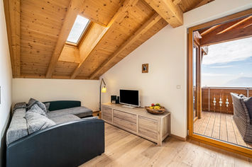 Die Ferienwohnung hat ein Doppelzimmer mit Balkon, ein Wohnzimmer mit Schlafsofa und ein Kinderzimmer, das mit einer Holztreppe begehbar ist. Das Apartment verfügt über eine vollausgestattete Wohnküche mit Spülmaschine, Sat TV, WLAN, Dusche/Bad mit WC/Bidet, Haartrockner, Bodenheizung, Holz- und Fliesenböden, Sauna und eine wunderschöne Dachterrasse.